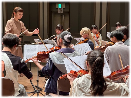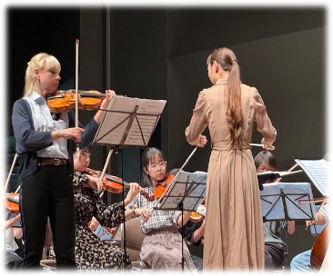 10月13日(祝)ぐんまJr.の10月練習会にウィーンフィルハーモニーオーケストラで来日中のバイオリン 奏者のエカテリーナ先生が休日を利用されて、玉村文化センターに指導に来てくださいました。 モーツアルトの25番交響曲では、久しぶりに参加したコンミスのミラちゃん(高2)のの隣で、一緒に弾て もらいました。団員たちは世界一流奏者との共演を楽しみました。ぐんまJr.は、ウィーンの音楽家との交流は 何度も経験していますが、現在の団員たちにとっては、ほとんどが初めての経験だったと思います。 本来、音楽は感じるものですから身近で生の演奏を感じてもらい、音楽のすばらしさを再確認できた事だと 思います。この機会に個人レッスンを受けた上級生の団員たちは、あっという間に演奏に変化が表れていました ので、今後の音楽活動に大きな影響があると確信しました。前回のウィーンの音楽家との交流は、2019年3月 ウィーン楽友協会ホールでヨハネスさんとチャイコフスキーのバイオリン協奏曲を全楽章共演しました。