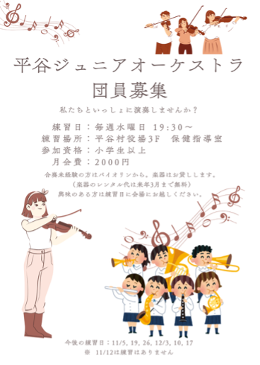 11月3日(祝)長野県平谷村(人口370人・全校生徒17人)でバイオリン体験会を開催します。